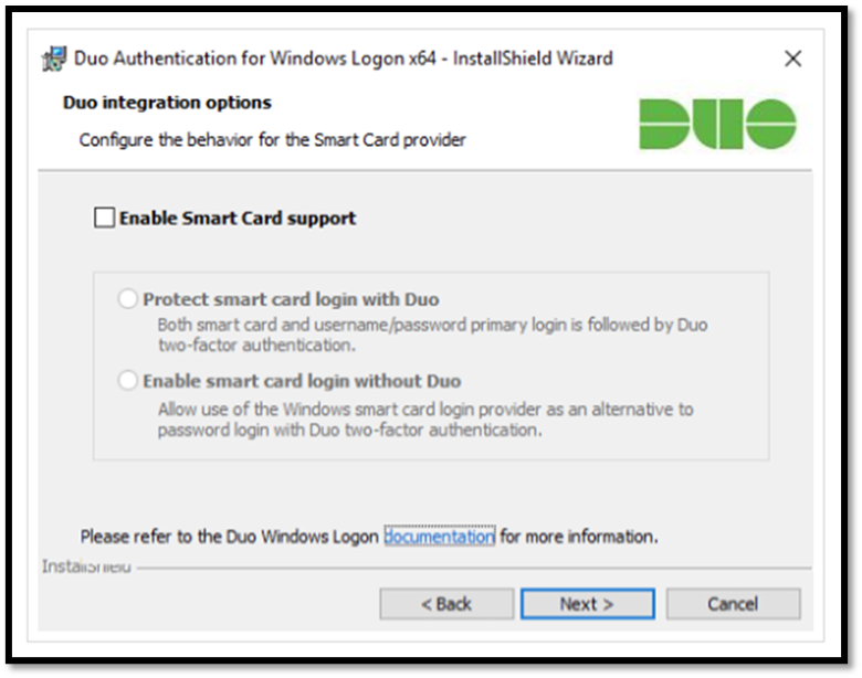 - To use smart cards on the systems where Duo is installed, click Enable Smart Card Support, and select preferred smart card options OR else click Next.